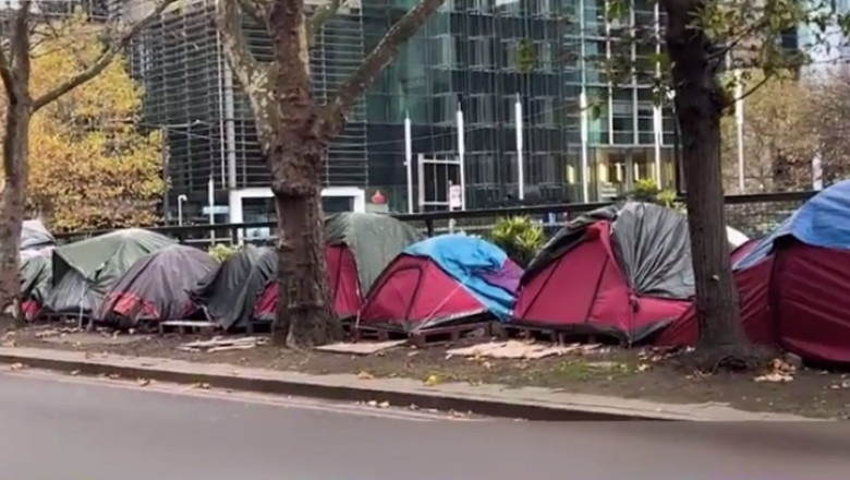 Imagini surprinse în centrul Londrei arată un peisaj dezolant, cu zeci de persoane fără adăpost care trăiesc în corturi, printre care se numără români și bulgari. Pe una din arterele comerciale importante, magazinele de lux coexistă cu sărăcia evidentă a mahalei improvizate.