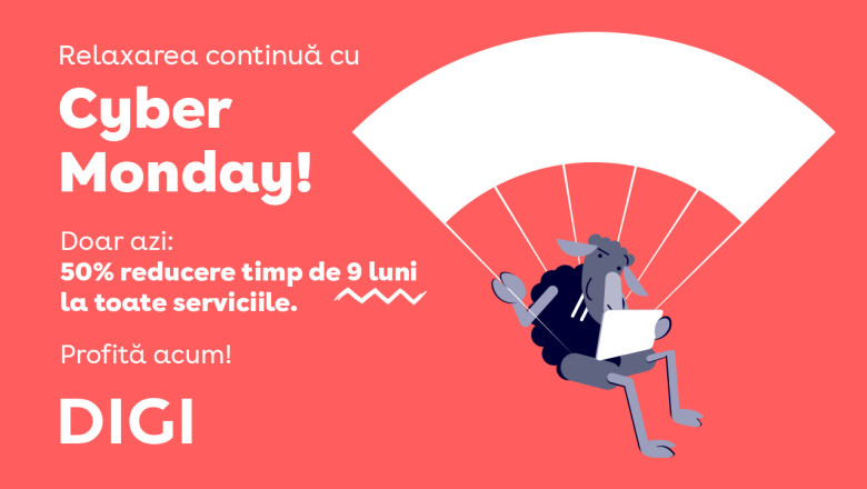 Digi oferă o nouă promoție Cyber Monday luni, 10 noiembrie, prin care abonații noi și cei existenți pot plăti doar jumătate din prețul abonamentului timp de 9 luni. Oferta este valabilă pentru toate serviciile, inclusiv internet, telefonie mobilă și televiziune, indiferent de pachetul ales.